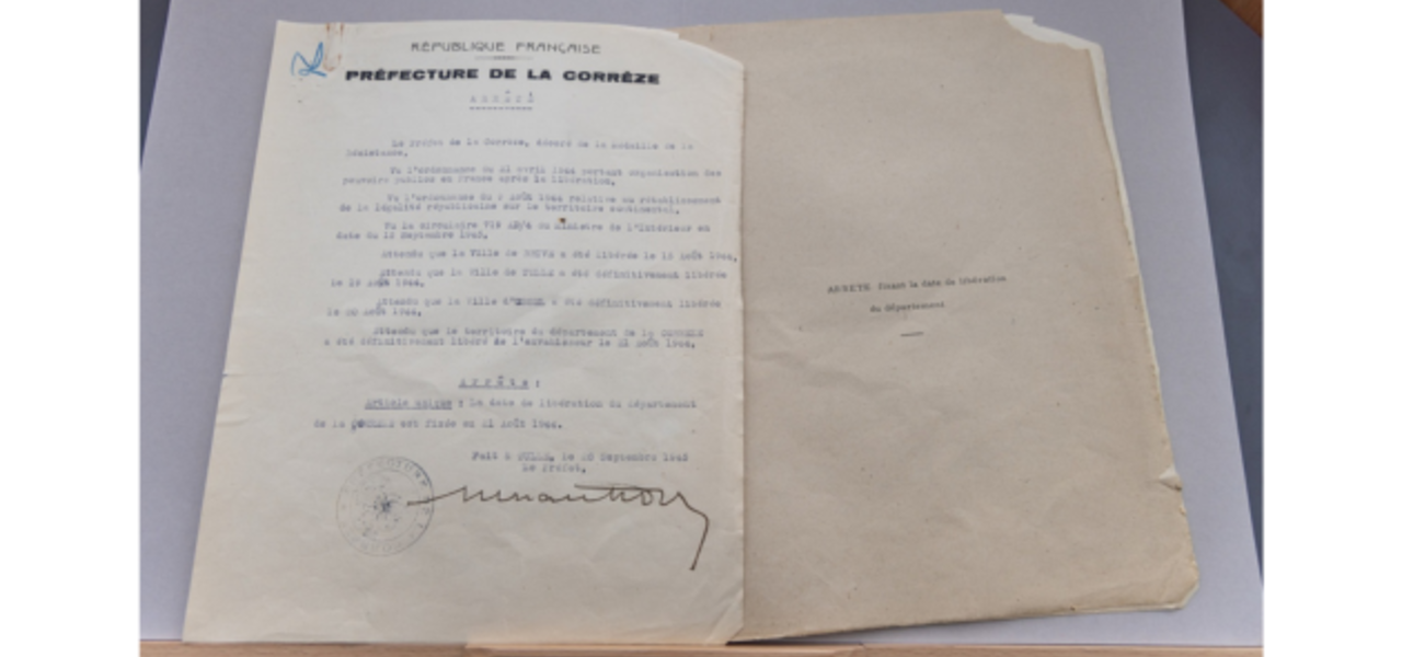 En cette année spéciale, le Préfet de la Corrèze a remis officiellement l'arrêté préfectoral du 28 septembre 1945, lequel fixe la date de la libération de la Corrèze au 21 août 1944, aux Archives départementales.