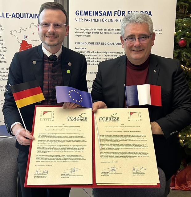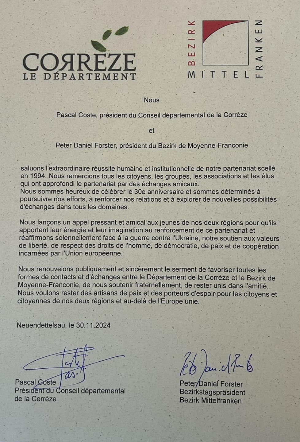 Le Président Pascal COSTE et le Président Peter Daniel Forster ont signé officiellement, ce jour, à Neuendettelsau, un renouvellement du partenariat entre nos 2 territoires ; l’occasion de saluer l'extraordinaire réussite humaine et institutionnelle de ce partenariat scellé en 1994 et remercier les comités de jumelage qui font vivre chaque jour la fraternité lors des nombreux échanges amicaux organisés.