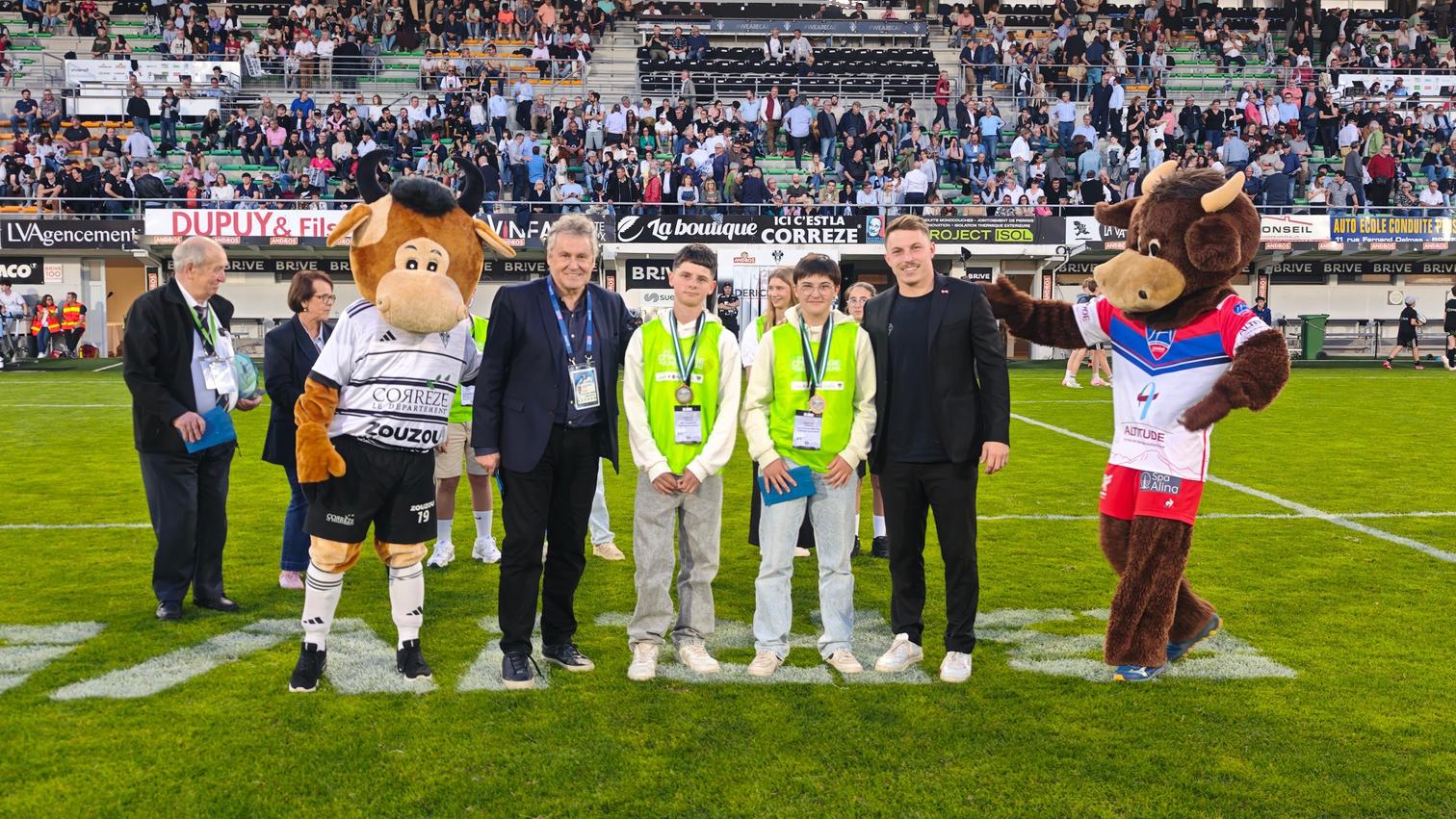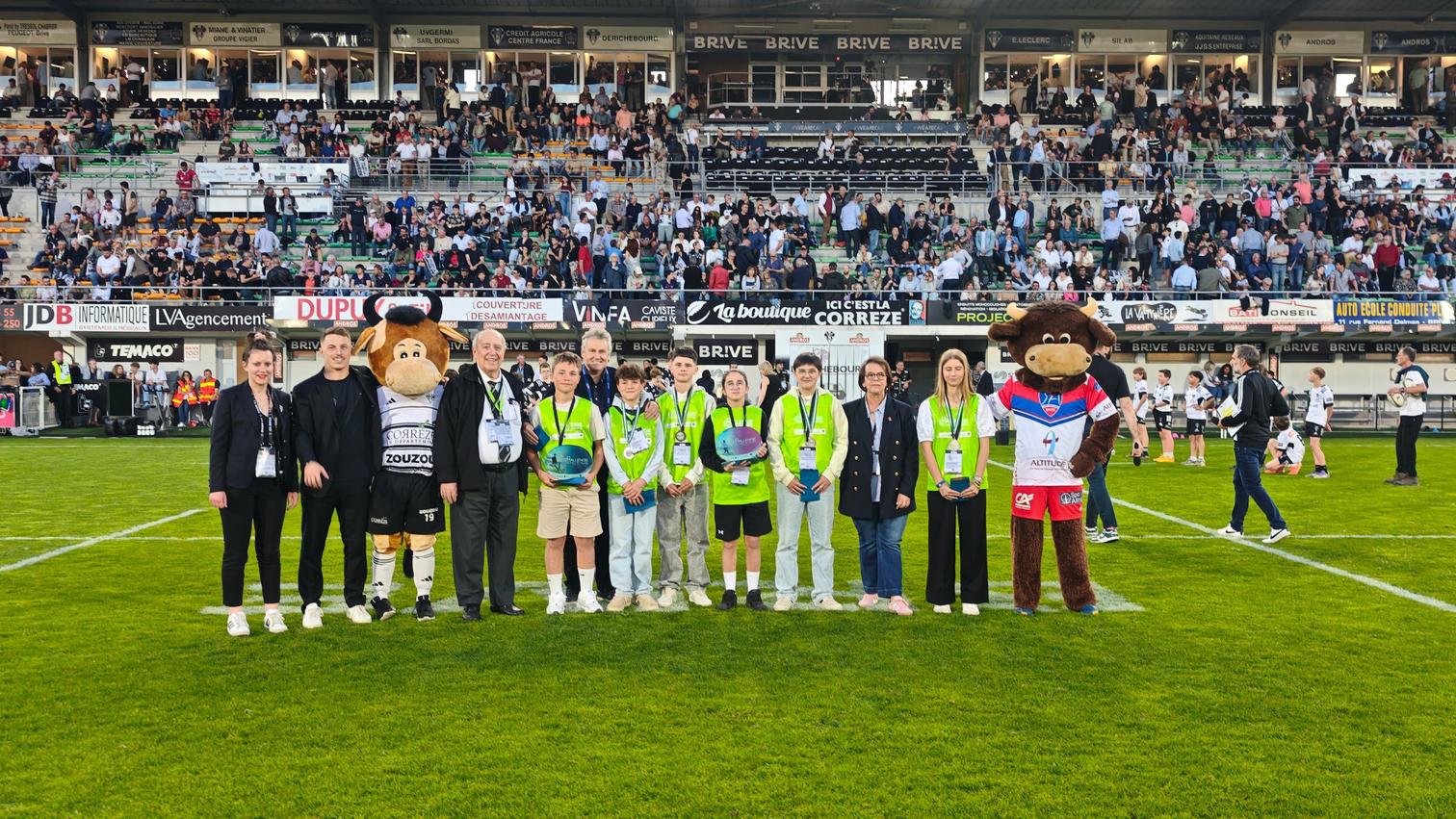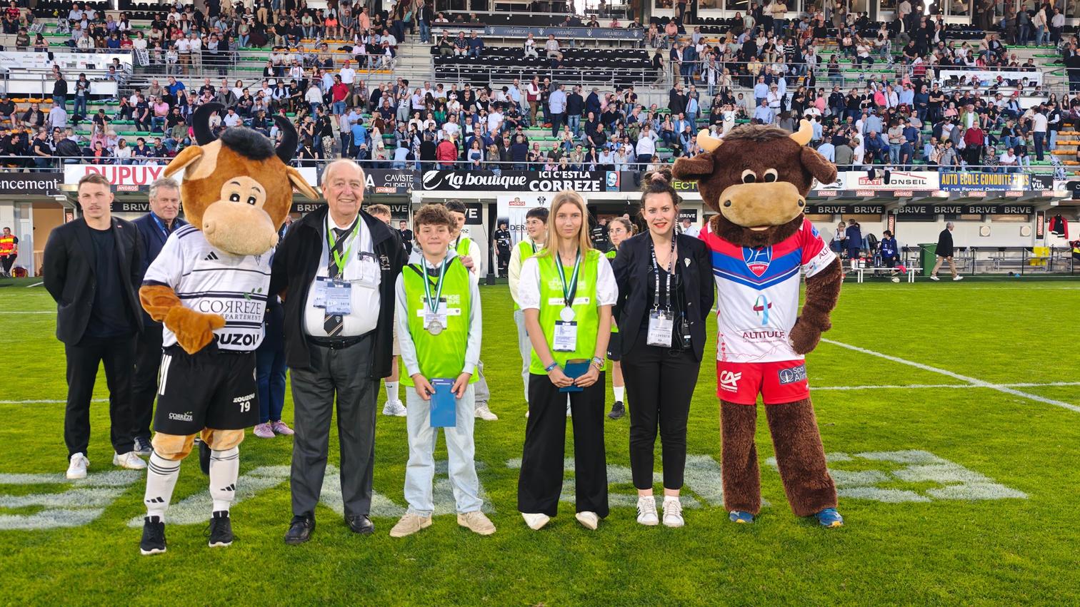 La remise des prix aux six gagnants s’est déroulée à la mi-temps du match contre le Stade Aurillacois, sur la pelouse, en présence de Thierry Blandinières, Président du CA Brive Rugby, Jean-Jacques Lauga, Conseiller départemental délégué aux sports et à la jeunesse, Patricia Leba-Dandaleix, Présidente du Comité de rugby de la Corrèze, Marie Roussie, marraine du Challenge, ainsi que Maxime Sidobre joueur du CAB.