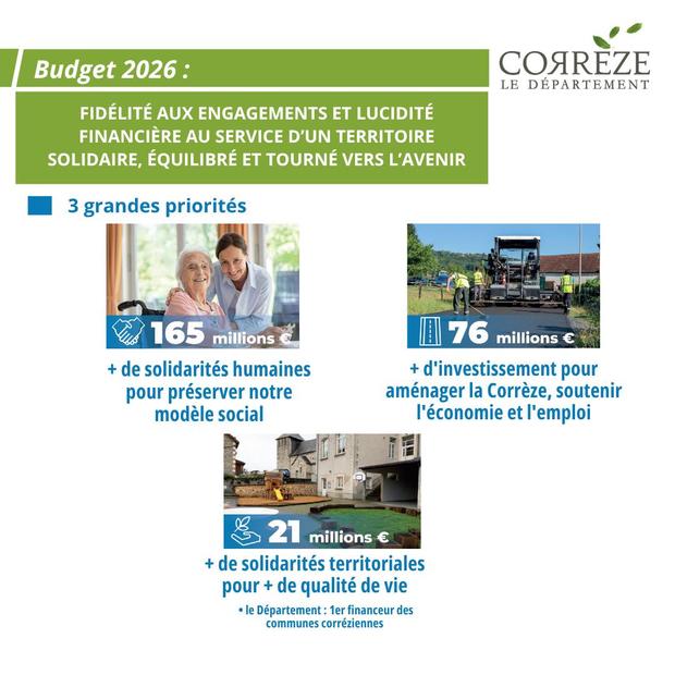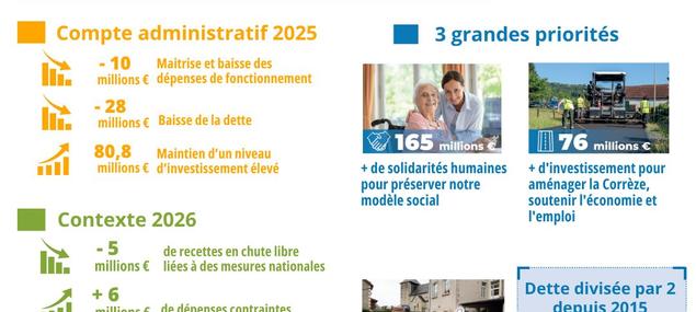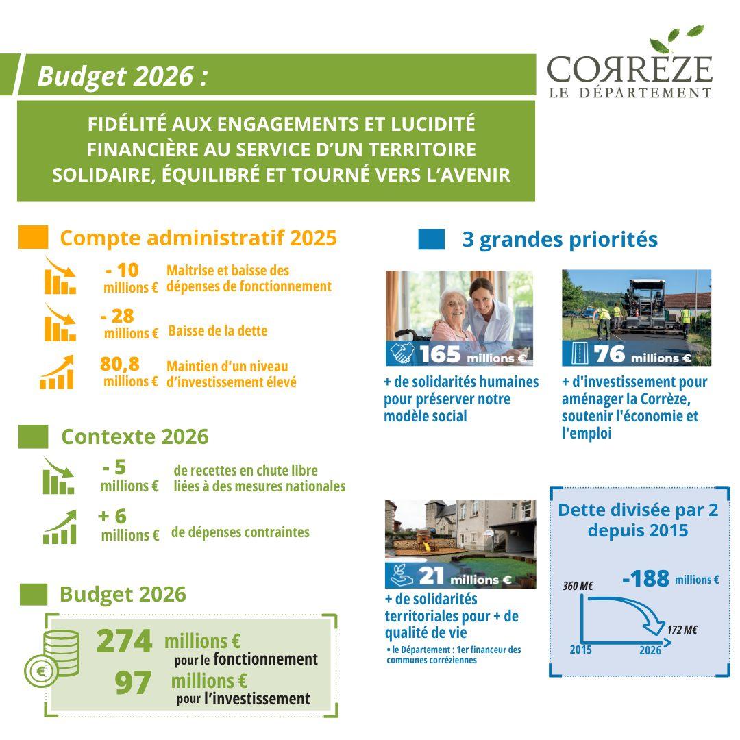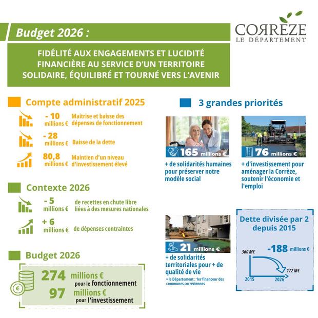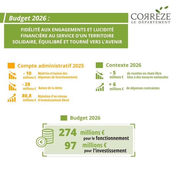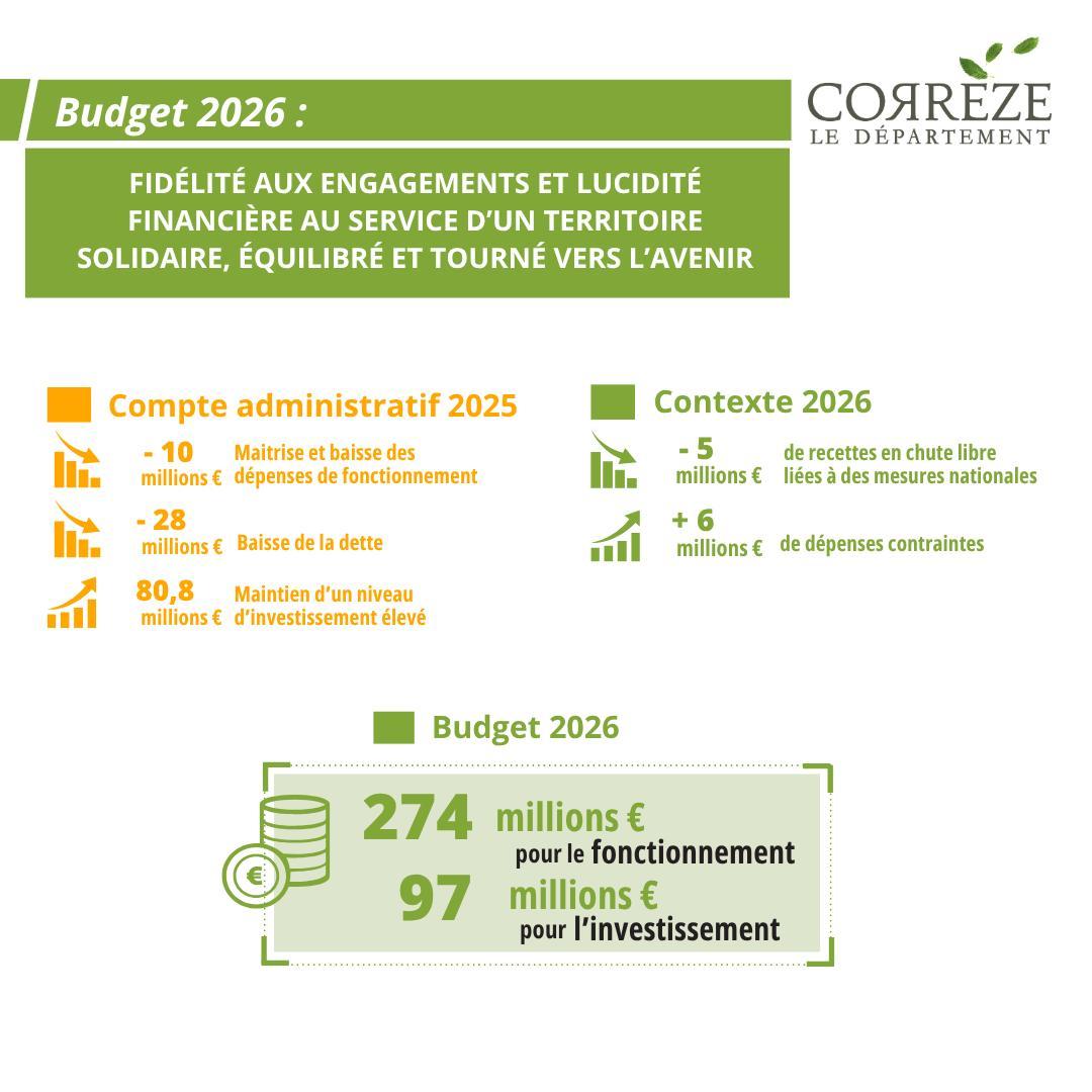 Le Conseil départemental de la Corrèze a adopté ce jour un budget 2026 de combat pour tenir le cap malgré les incertitudes. Fidélité aux engagements et lucidité financière au service d'un territoire solidaire, équilibré et tourné vers l'avenir.