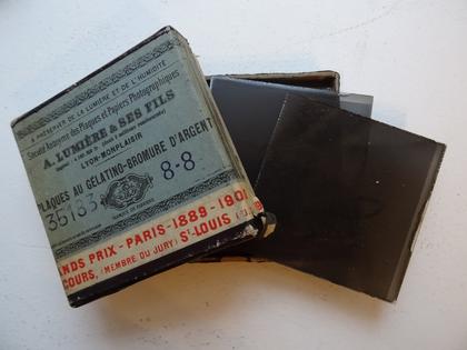Apparus dans les années 1850, ces supports sont constitués d'une plaque de verre recouverte d'une émulsion sensible à la lumière. Très fragiles, ils laissent voir des images en positif ou en négatif. C'est l'ancêtre de la pellicule !