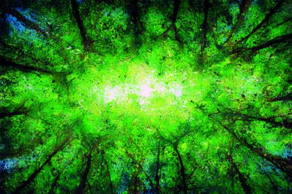 Coulures et projections se muent en rayons de lumière et troncs d'arbre. Sombre et mystérieuse, sa forêt s'illumine de mille feux sous ses doigts